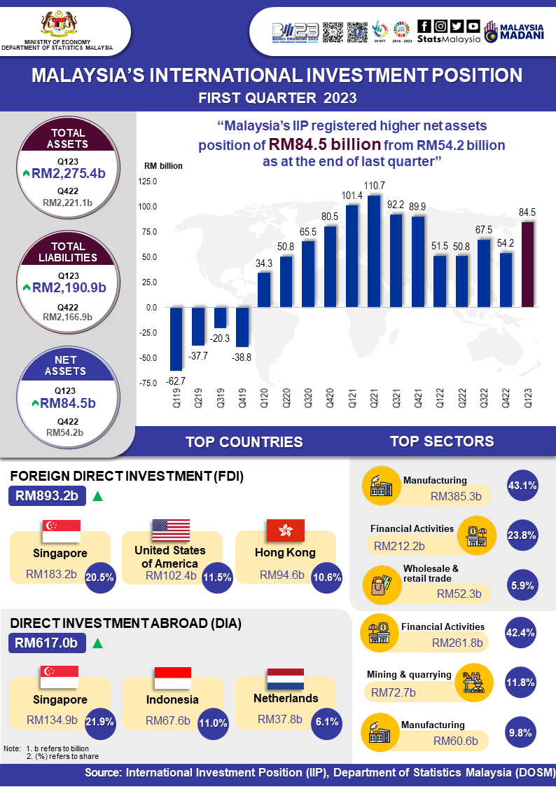 Malaysia’s International Investment Position (IIP) registered higher net assets of RM84.5 billion as at the end of first quarter 2023 (Q4 2022: net assets RM54.2 billion). The total financial assets increased to RM2,275.4 billion from RM2,221.1 billion in last quarter. Simultaneously, total liabilities posted a higher value of RM2,190.9 billion as compared to RM2,166.9 billion in previous quarter.