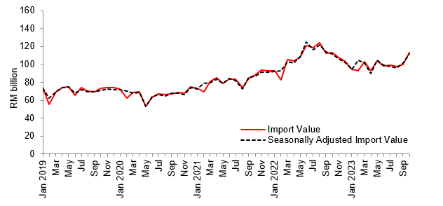 Malaysia's imports decreased by 0.2 per cent, or RM193.1 million, from RM113.5 billion in October 2022 to RM113.3 billion. Compared to September 2023, imports increased by 13.4 per cent, or RM13.4 billion, on a monthly basis.