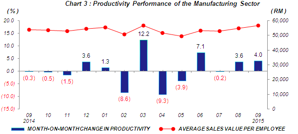 Productivity or average sales value per employee in September 2015 increased by 5.8% as compared with the same month of the previous year. Meanwhile, productivity in September 2015 increased by 4.0% month-on-month to register RM56,928 (Chart 3). |
