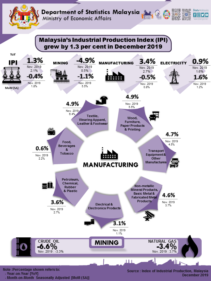 Malaysia’s Industrial Production Index (IPI) grew by 1.3 per cent in December 2019
