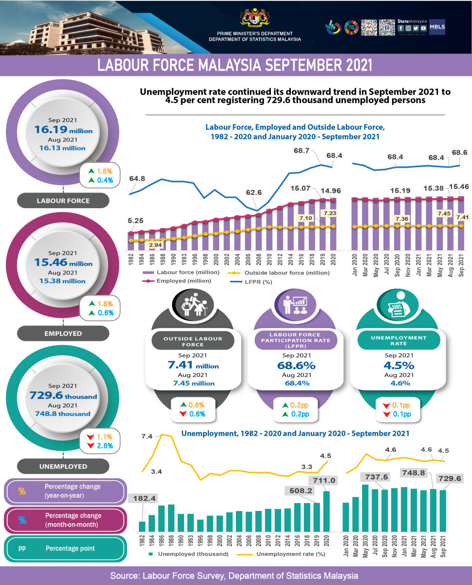 The Labour Force Report for September 2021 describes the labour supply situation as the country entered the various phases of the NRP. The report also elaborate on the month-on-month changes to examine the immediate effects of the NRP to rejuvenate the economy while containing the spread of COVID-19. Users are advised to interpret the monthly statistics with caution since they are non-seasonally adjusted. In addition, annual changes from the same month of the previous year are also reported.