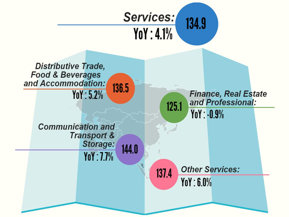 Index of Services covers eleven (11) sub-sectors which are Distributive Trade, Finance & Insurance, Information & Communication, Transportation & Storage, Food & Beverages, Real Estate, Professional, Private Health, Private Education, Accommodation and Arts, Entertainment & Recreation. The index derived from Monthly Survey of Distributive Trade, Quarterly Survey of Services and secondary sources.