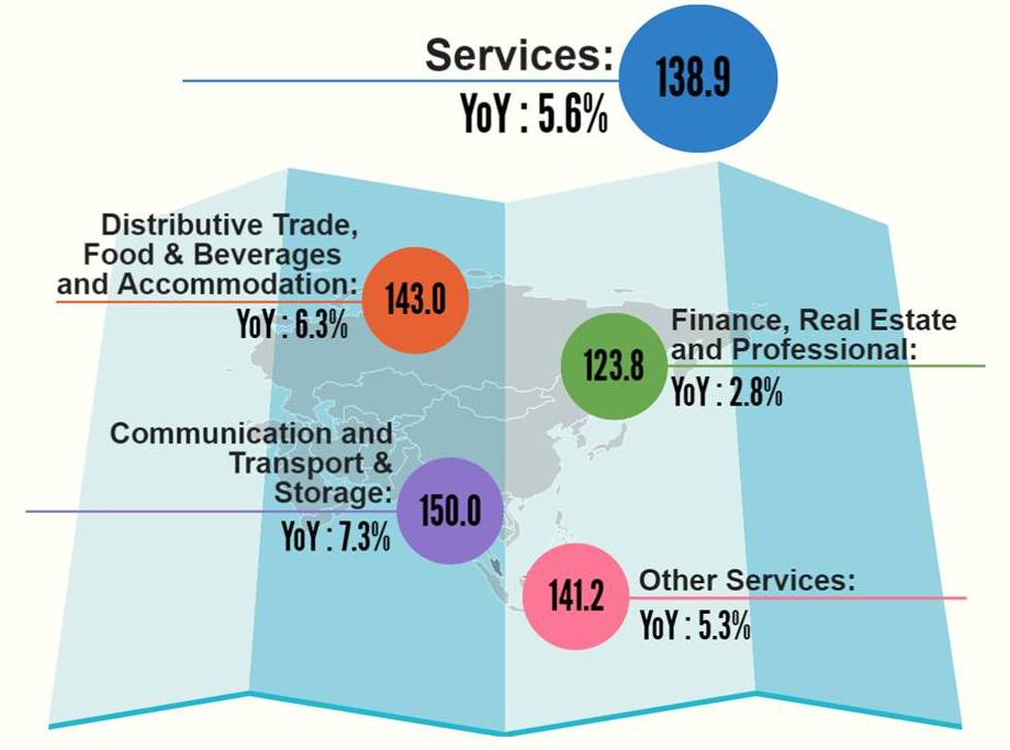 The increase was driven by the growth in the segment of Communication and Transport & Storage (7.3%); Distributive Trade, Food & Beverages and Accommodation (6.3%); Other Services (5.3%) and Finance, Real Estate and Professional (2.8%). As compared with the previous quarter, the seasonally adjusted index of services sector edged up by 0.1 per cent.