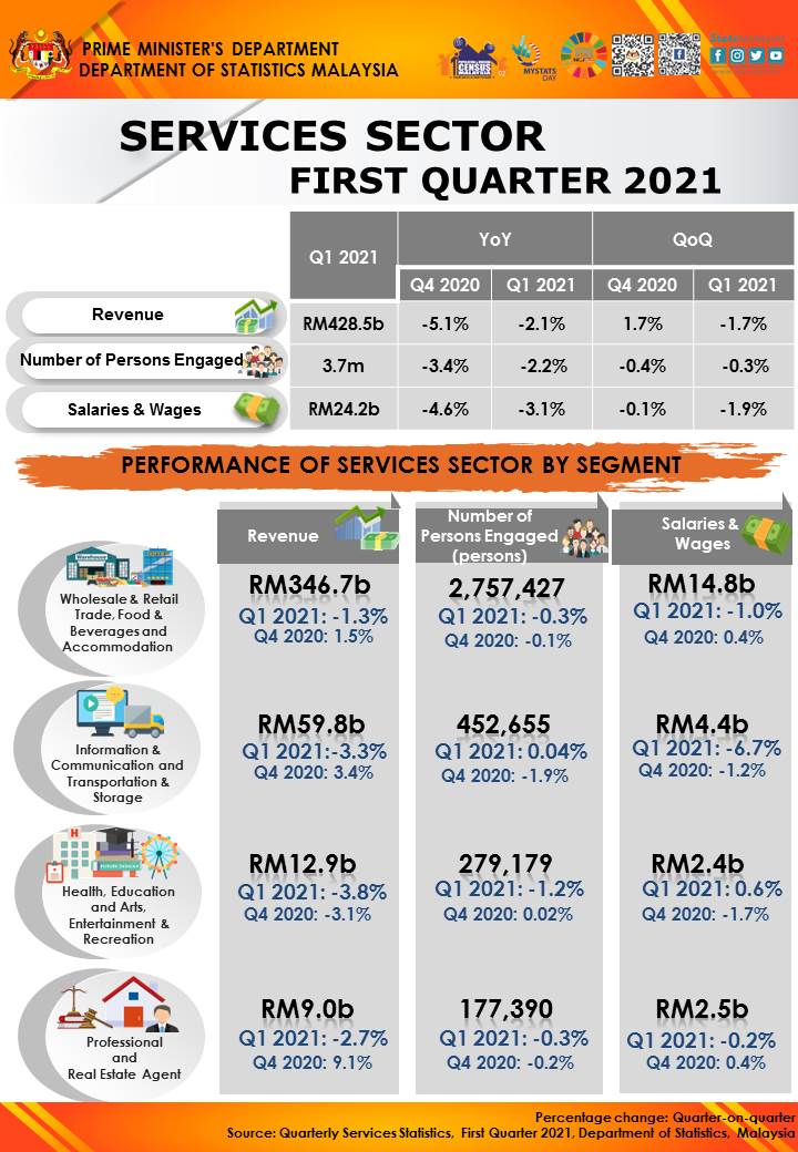 Total revenue of Services sector in first quarter 2021 recorded RM428.5 billion, decreased -1.7 per cent as compared to the fourth quarter 2020. The growth was contributed by Wholesale & Retail Trade, Food & Beverages and Accommodation segment (-RM4.6 billion; -1.3%). Meanwhile, total revenue on annual comparison contracted by -2.1 per cent, compared to -5.1 per cent in the previous quarter.