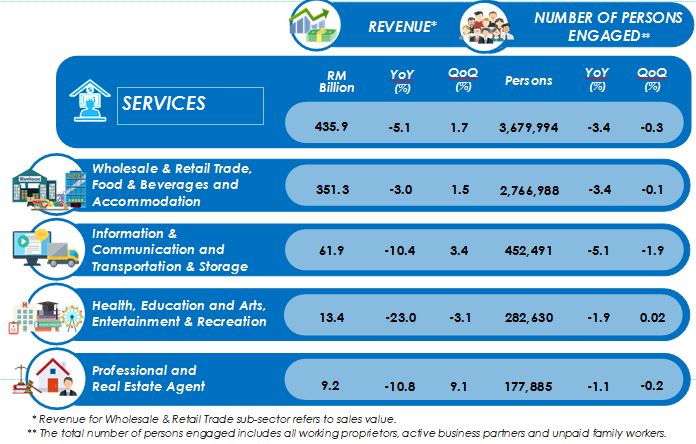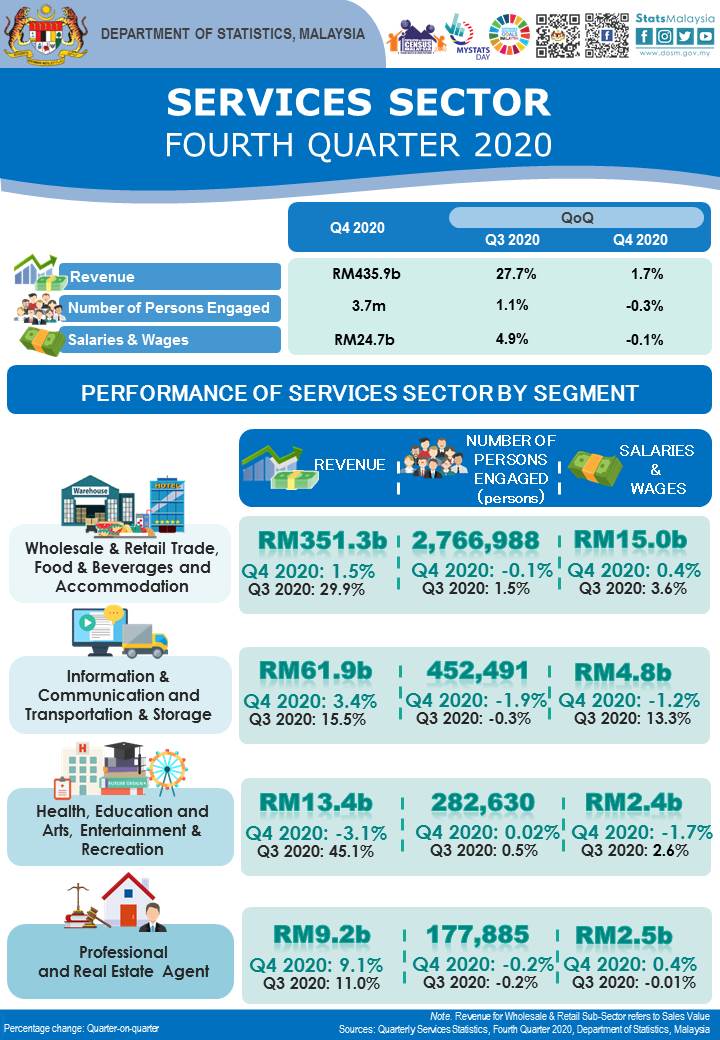 Total revenue of Services sector in fourth quarter 2020 recorded RM435.9 billion, increased 1.7 per cent as compared to the third quarter 2020. The growth was contributed by Wholesale & Retail Trade, Food & Beverages and Accommodation segment (+RM5.1 billion; +1.5%). Meanwhile, total revenue on annual comparison contracted by 5.1 per cent in the fourth quarter, from -4.7 per cent in the previous quarter.