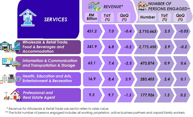 Total revenue for Wholesale & Retail Trade, Food & Beverages and Accommodation segment recorded a positive growth of 6.8 per cent to RM341.9 billion year-on-year. The robust growth was contributed by Wholesale & Retail Trade sub-sector (+RM19.8 billion,+6.6%). For quarterly comparison, this segment recorded a negative growth of 0.2 per cent.