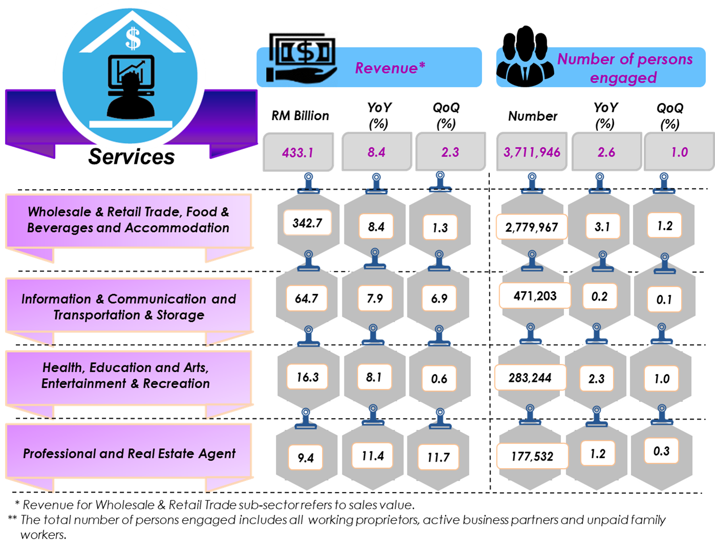 This publication presents statistics on Services sector which encompasses the sub-sectors of Wholesale & Retail Trade; Information & Communication; Transportation & Storage; Food & Beverages; Professional; Private Health; Private Education; Accommodation; Arts, Entertainment & Recreation and Real Estate Agent for the period from year 2012 until fourth quarter 2018.