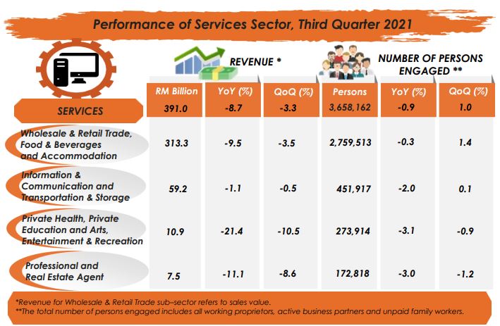 Revenue for Services sector in the third quarter 2021 registered RM391.0 billion, declined 8.7 per cent