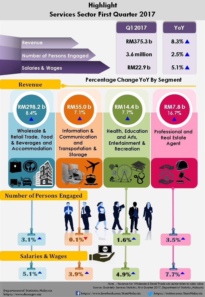 The Revenue for Services Sector increased 8.3 per cent or RM375.3 billion in the First Quarter 2017