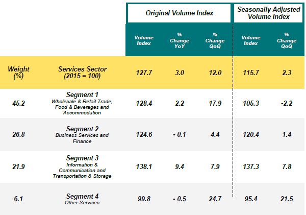 Volume index of Wholesale & Retail Trade, Food & Beverages and Accommodation segment swelled by 2.2 per cent to 128.4 points as compared to the same quarter of previous year. The Accommodation sub-sector was the main contributor to the increase in this segment which registered 46.6 per cent. For quarterly comparison, this segment increase by 172.2 per cent as compared to the previous quarter.