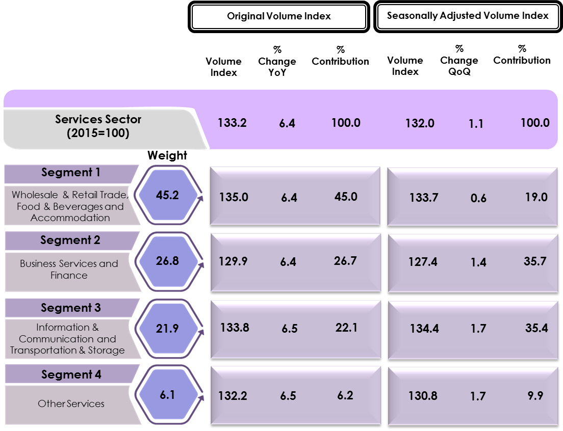 Volume index of Information & Communication and Transportation & Storage segment recorded a positive growth of 6.5 per cent as compared with the same quarter of previous year. The growth was contributed by Information & Communication sub-sector with 6.6 per cent. Seasonally adjusted volume index in this segment posted an increase of 1.7 per cent.