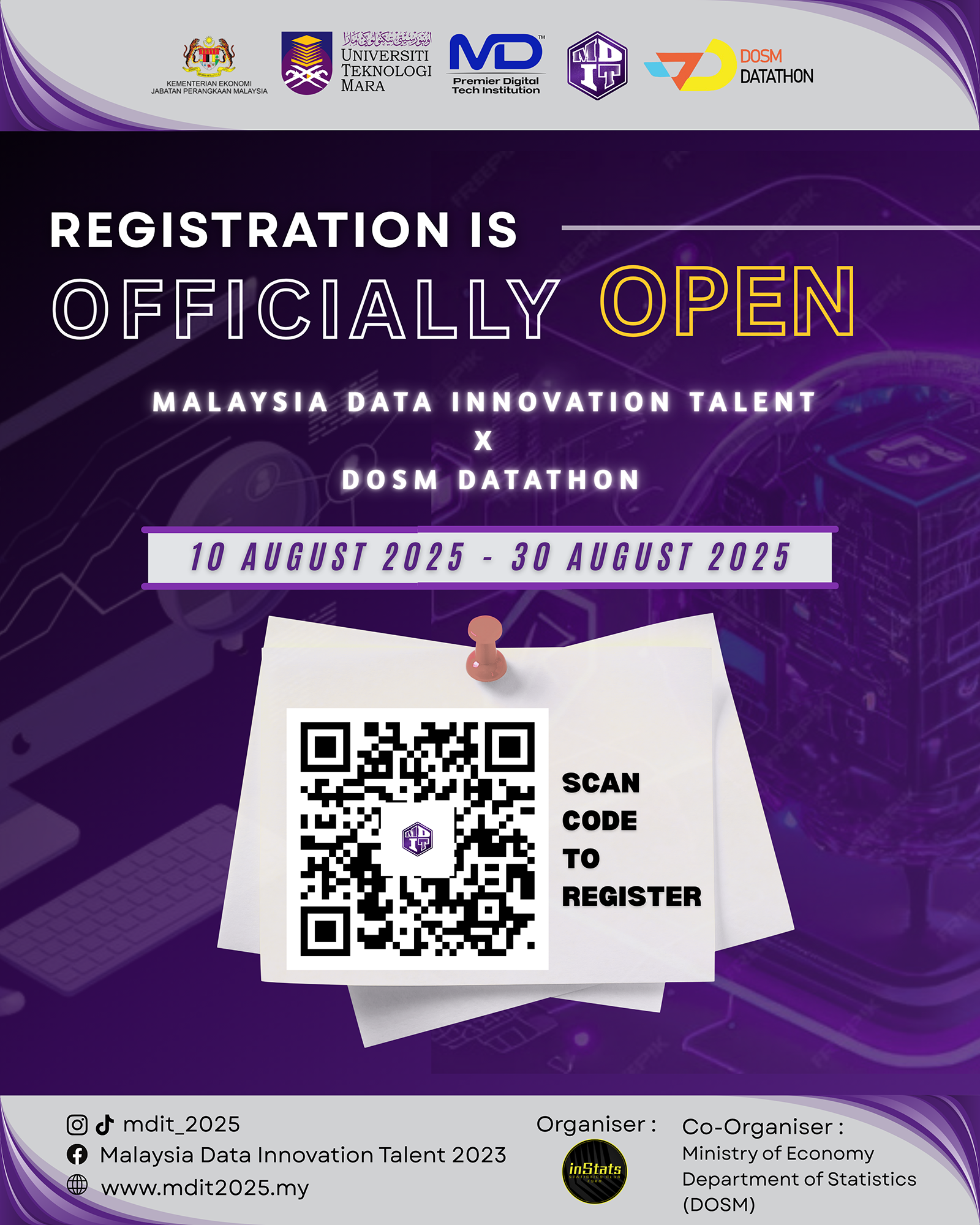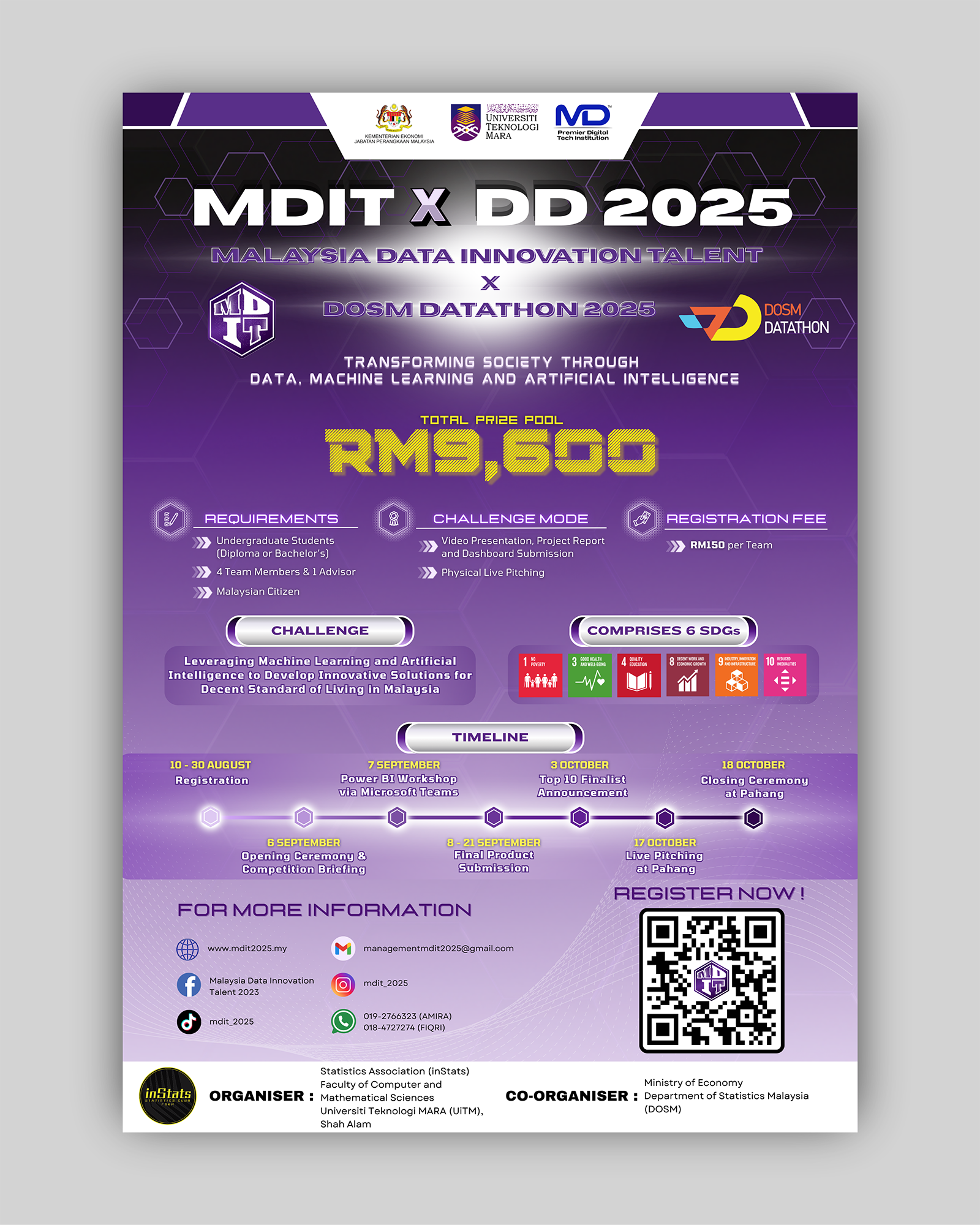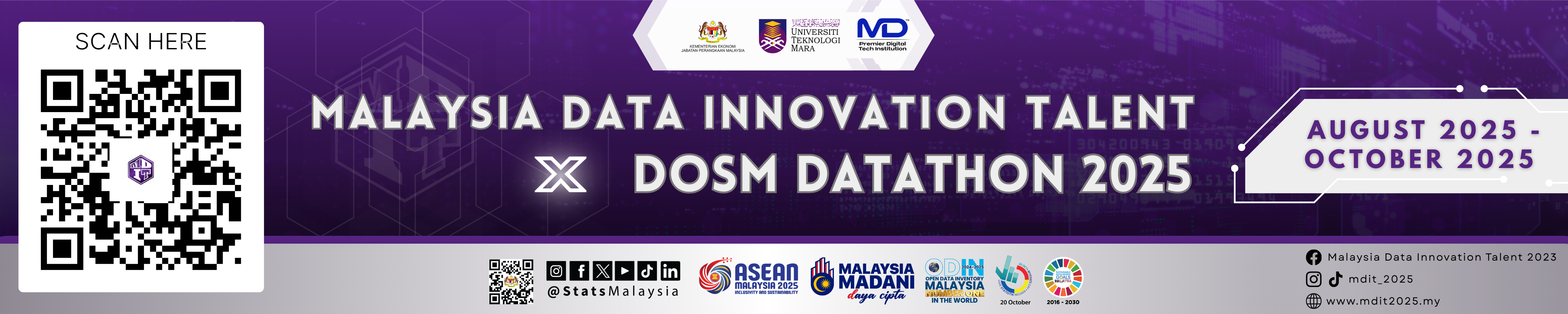 DOSM Datathon or The Malaysia Data Innovation Talent x DOSM Datathon 2025 (MDIT x DD 2025) is a national-level competition organised by Department of Statistics, Malaysia (DOSM) in collaboration with Faculty of Computer and Mathematical Sciences (FSKM), Universiti Teknologi MARA (UiTM). The competition, which is open to university students, provides an opportunity for them to develop their skills in data analysis and the use of the latest technology software. In an increasingly data-driven world, the ability to analyse and understand data is an extremely important skill. This also helps students enhance their competitiveness in the increasingly competitive job market while supporting the country's capacity development in data science and analytics. With the theme focusing on current issues of "Leveraging ML and AI to develop innovative solutions for Decent Standard of Living in Malaysia", this competition also aims to encourage innovation and creative solutions among students, as well as foster collaboration and professional networking among participants from various institutions.