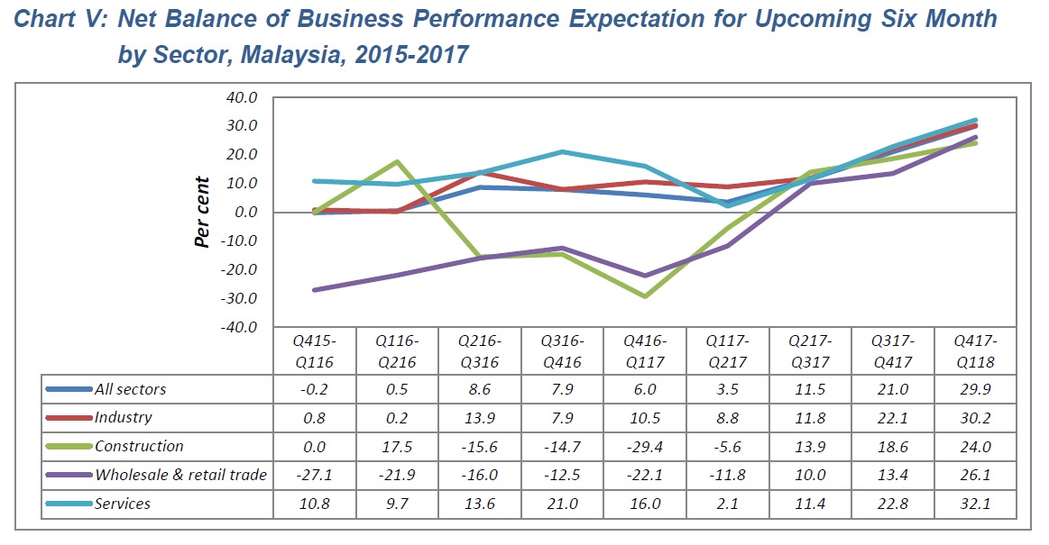 The business performance in the fourth quarter of 2017 is expected to increase as recorded by the confidence indicator of +14.0 per cent contributed by industry (+9.8%), construction (+22.8), wholesale & retail trade (+8.3%) and services (+23.6%) sectors.
