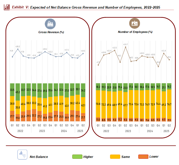 In terms of employment, 76.7 per cent of businesses are expecting to retain their staff throughout the second quarter of 2025. Approximately 16.2 per cent of respondents anticipate to hire more, while 7.1 per cent expect to reduce their personnel, resulting in a net balance of +9.1 per cent for the reference quarter (Exhibit V).