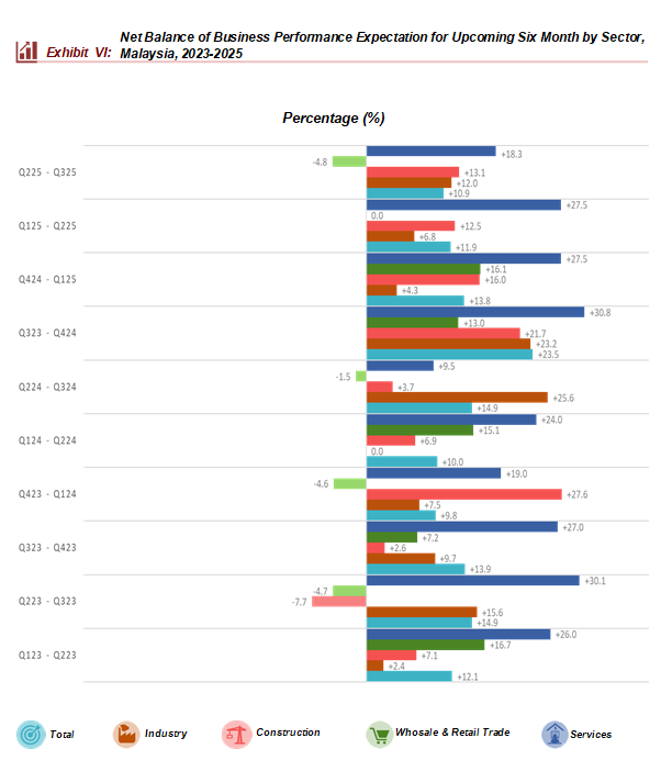 In Q2 2025, the Net Balance by State showed significant variation across Malaysia. States with optimistic sentiment included Johor (+13.8%), Kedah (+9.2%), Kelantan (+6.2%), Melaka (+9.6%), Negeri Sembilan (+10.1%), Pahang (+9.0%), Perak (+8.6%), Selangor (+13.1%), Terengganu (+44.7%), Sabah (+9.6%), W.P. Kuala Lumpur (+12.8%), and W.P. Putrajaya (+18.7%). Conversely, several states indicated more cautious sentiment, namely Penang (-2.3%), Perlis (-2.9%), Sarawak (-3.8%), and W.P. Labuan (-18.2%), as illustrated in Exhibit IV.