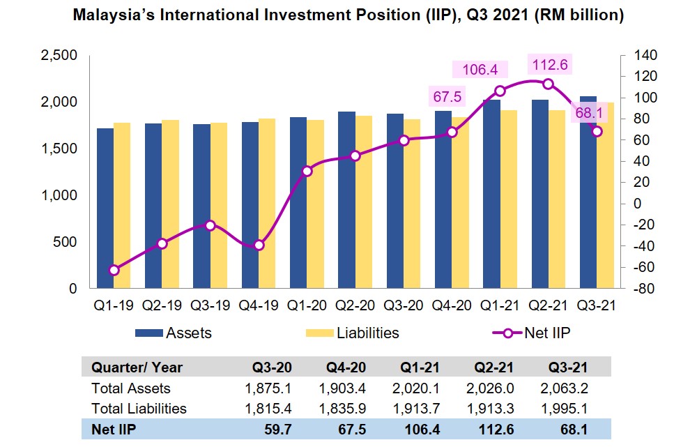 Malaysia’s International Investment Position (IIP) continued to record net assets position of RM68.1 billion (Q2 2021: net assets of RM112.6 billion). Total financial assets increased to RM2,063.2 billion while total liabilities registered a value of RM1,995.1 billion.