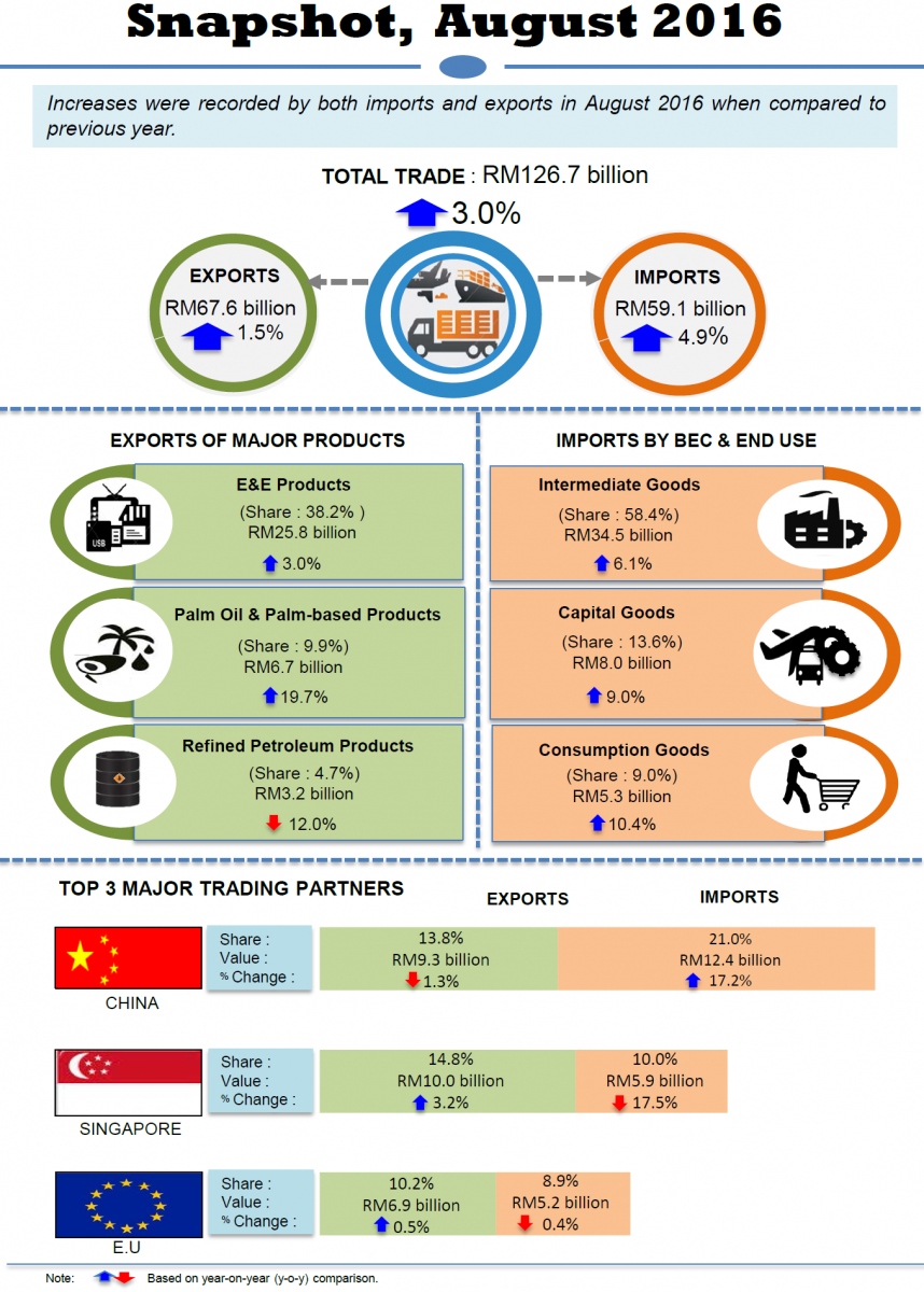 Total trade in August 2016, which was valued at RM126.7 billion, posted a growth of RM8.9 billion or 7.5% from the previous month. Similarly, a growth of 3.0% or RM3.7 billion was also recorded from a year ago. A trade surplus of RM8.5 billion was recorded and this was an expansion of RM6.6 billion (+346.0%) from the previous month. However, the trade surplus declined RM1.7 billion or 16.9% when compared with the previous year.