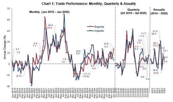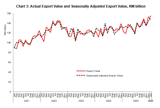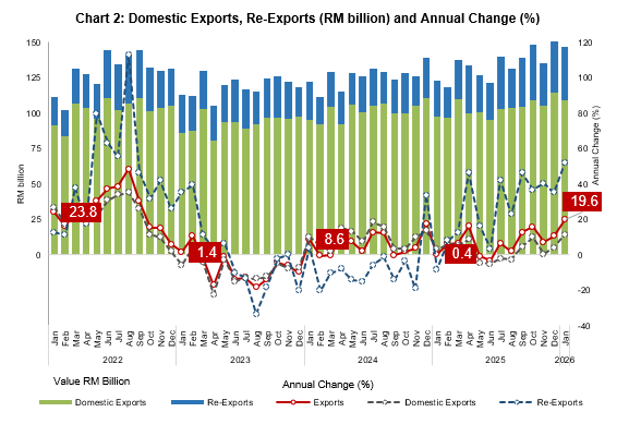 Exports rose by 19.6 per cent or RM24.1 billion to RM146.9 billion, while imports expanded by 5.3 per cent or RM6.3 billion to RM125.5 billion, year-on-year (y-o-y). Consequently, the trade balance valued at RM21.4 billion registered a surplus, widening by RM17.7 billion compared to January 2025.