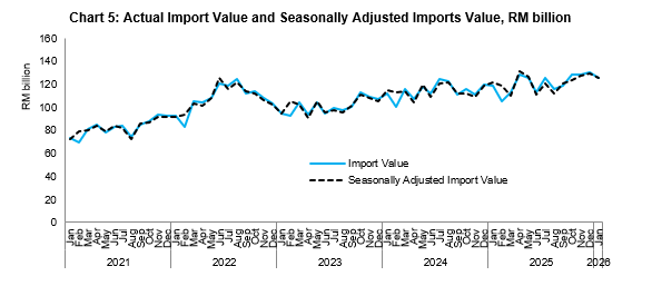Malaysia’s imports continued to record growth, rising by 5.3 per cent or RM6.3 billion in January 2026. This increase brought total imports to RM125.5 billion compared with the value recorded in the same month of the previous year. On a m-o-m comparison showed imports declined by 4.0 per cent or RM5.2 billion.