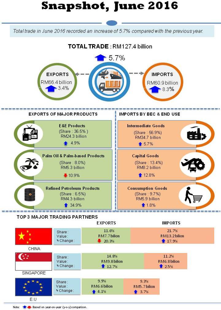 Total trade in June 2016, which was valued at RM127.4 billion, expanded RM10.8 billion or 9.2% from the previous month. A growth of RM6.8 billion or 5.7% was also recorded from a year ago. In June 2016, a trade surplus of RM5.5 billion was recorded, an increase of RM2.2 billion or 68.1% from the previous month. However, compared to the previous year, it declined RM2.5 billion or 30.8%.
