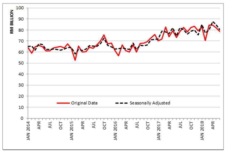 - On a m-o-m basis, imports decreased 1.9% or RM1.4 billion from RM74.0 billion. In seasonally adjusted terms, imports increased 0.3%.