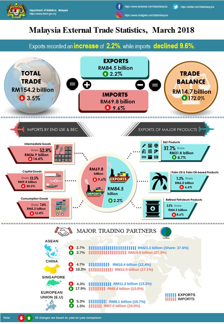 Total trade which was valued at RM154.2 billion decreased RM5.6 billion or 3.5% from a year ago. However, it posted an increase of RM22.6 billion or 17.1% when compared to the previous month. The trade surplus for March 2018 was RM14.7 billion, up by RM9.3 billion (+172.0%) from a year ago. It also grew RM5.7 billion or 62.9% when compared to the previous month.