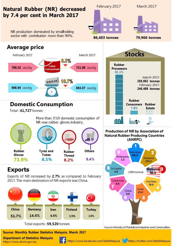 Production of NR in March 2017 decreased by 7.4 per cent to 79,966 tonnes as compared to previous month. The main contributor of NR production is from smallholding sector which is more than 90 per cent.