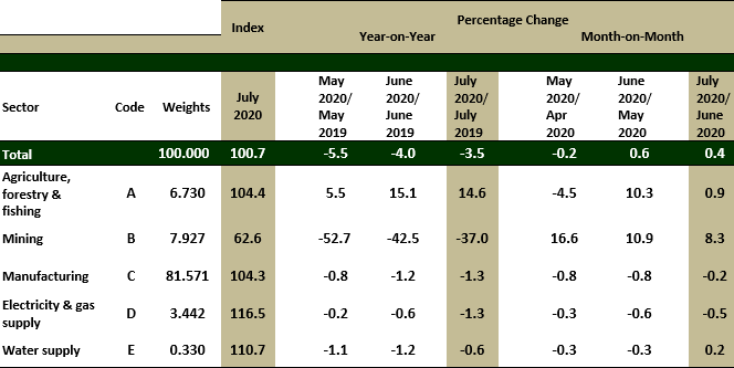 Producer Price Index (PPI) local production registered negative 3.5 per cent in July 2020 to 100.7 as against 104.4 in the same month of the preceding year. The decline of PPI local production in July 2020 was smaller than the decline in the previous two months. This is the effect of the lower oil prices that caused the Mining index to remain in the negative phase of 37.0 per cent. Similarly, the index of Manufacturing and Electricity & gas supply also recorded a decrease of 1.3 per cent respectively. Meanwhile, Water supply index fell 0.6 per cent. However, the index of Agriculture, forestry & fishing rose 14.6 per cent.