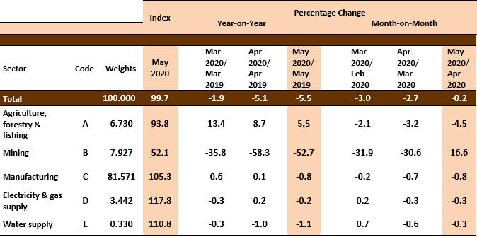 The Producer Price Index (PPI) local production which measures costs for goods at the factory gate, decreased 5.5 per cent year-on-year in May 2020, marking the third consecutive months in a row of the index to fall into negative territory. The decrease in the overall index was driven by the decline in the index of Mining (-52.7%) due to the slump in the global commodity prices namely crude oils and natural gas. In addition, Water supply (-1.1%), Manufacturing (-0.8%) and Electricity & gas supply (-0.2%) were also contributed to the decrease in the index. Conversely, the index of Agriculture, forestry & fishing edged up by 5.5 per cent.