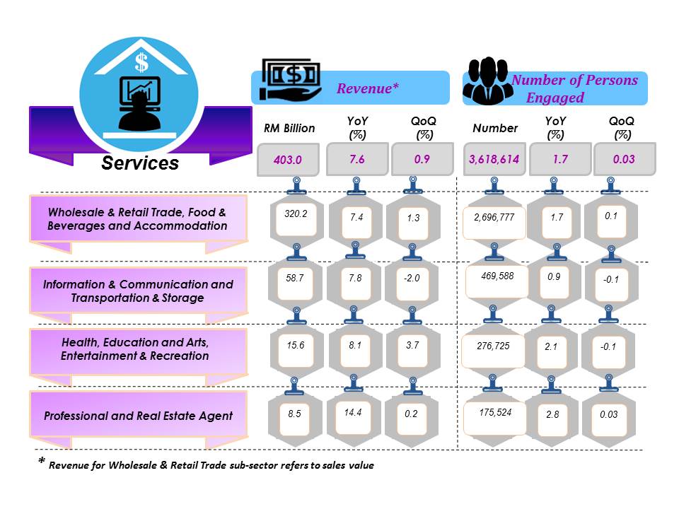 Revenue of services sector increased 7.6 per cent to RM403.0 billion in first quarter 2018 as compared to the same quarter 2017. The highest growth was registered by Professional and Real Estate Agent (14.4%) and Health, Education and Arts, Entertainment & Recreation (8.1%) segments. Meanwhile, the total revenue on quarterly basis increased RM3.4 billion or 0.9 per cent.
