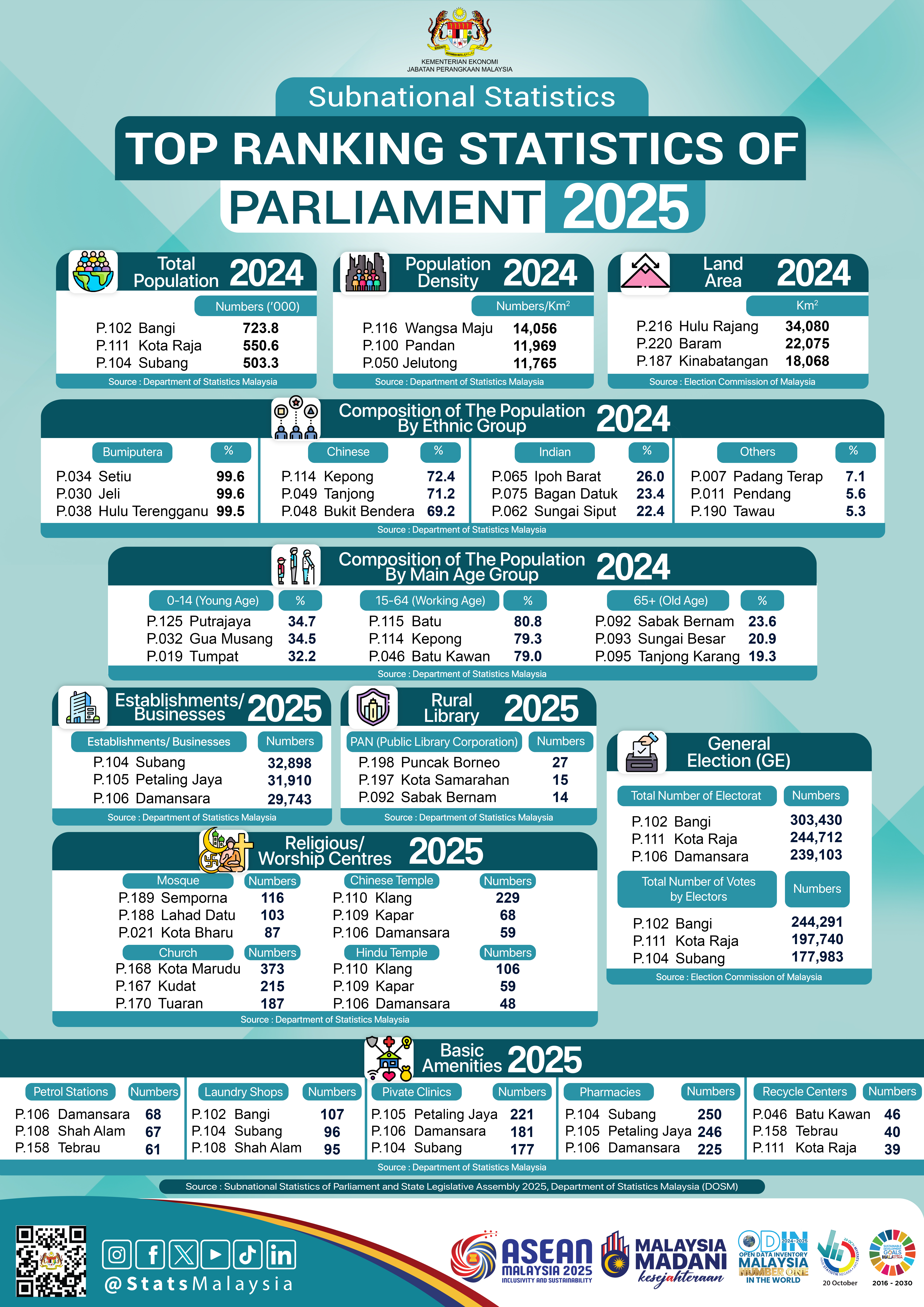 In the context of economic establishments, parliaments in Selangor continue to lead. P.104 Subang recorded the highest number of establishments with 32,898, followed by P.105 Petaling Jaya (31,910) and P.106 Damansara (29,743).