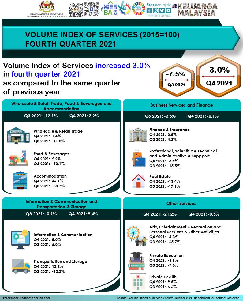 The full publication of the Quarterly Volume Index of Services, Fourth Quarter 2021 can be downloaded through eStatistik portal.