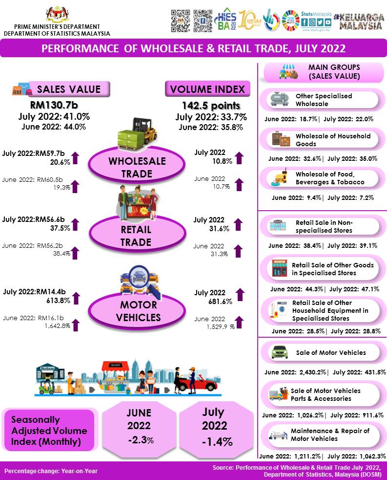 The full publication of the Performance of Wholesale & Retail Trade, July 2022 can be downloaded through eStatistik Portal.