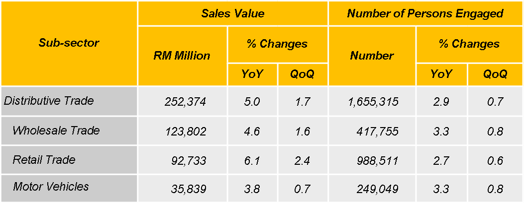 Sales value of the Wholesale Trade sub-sector registered a 4.6 per cent growth to RM123.8 billion as compared to last year. Quarter-on-quarter, this sub-sector recorded an increase of 1.6 per cent.